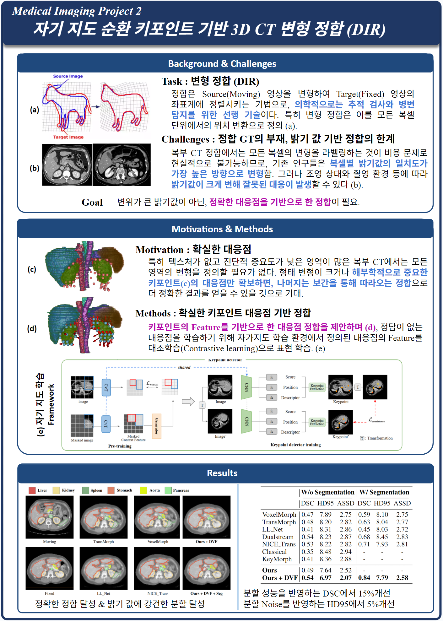 3D CT 간 정합에서 Intensity 변화에 취약한 문제를 해결하기 위해, Self-supervised 방식으로 학습한 신뢰성 높은 Keypoint 기반 정합 기법 제안